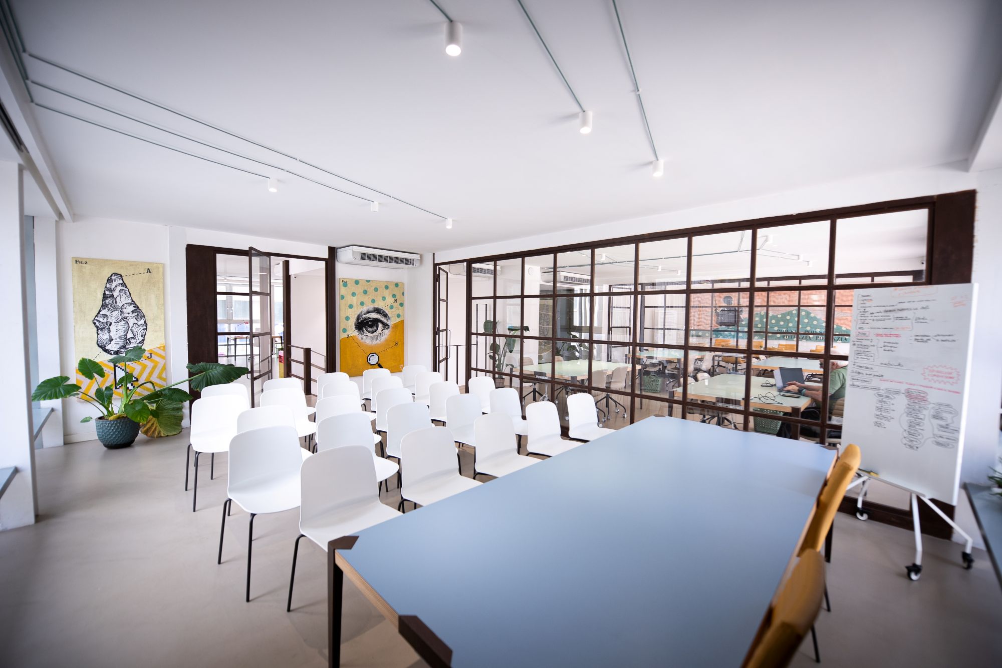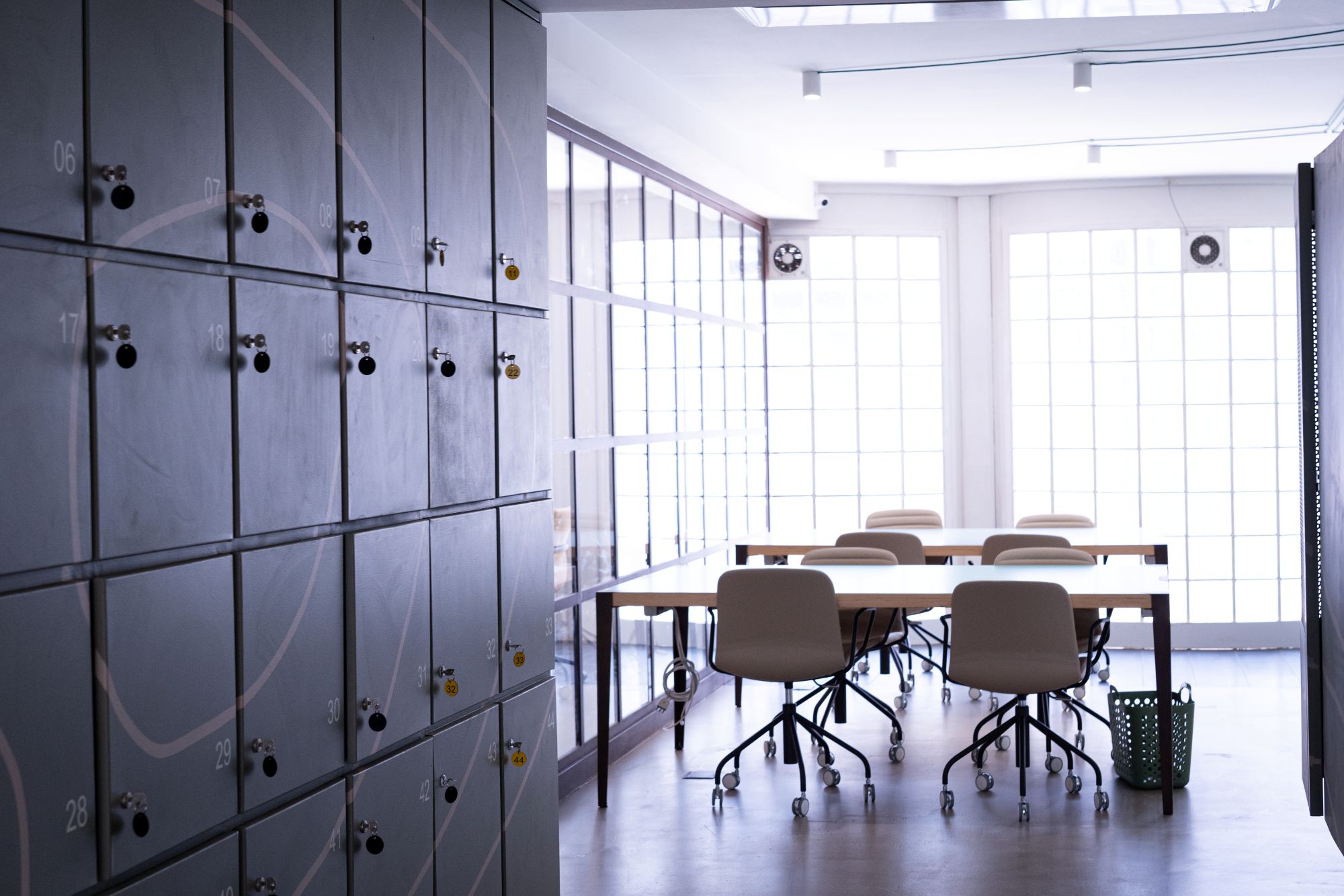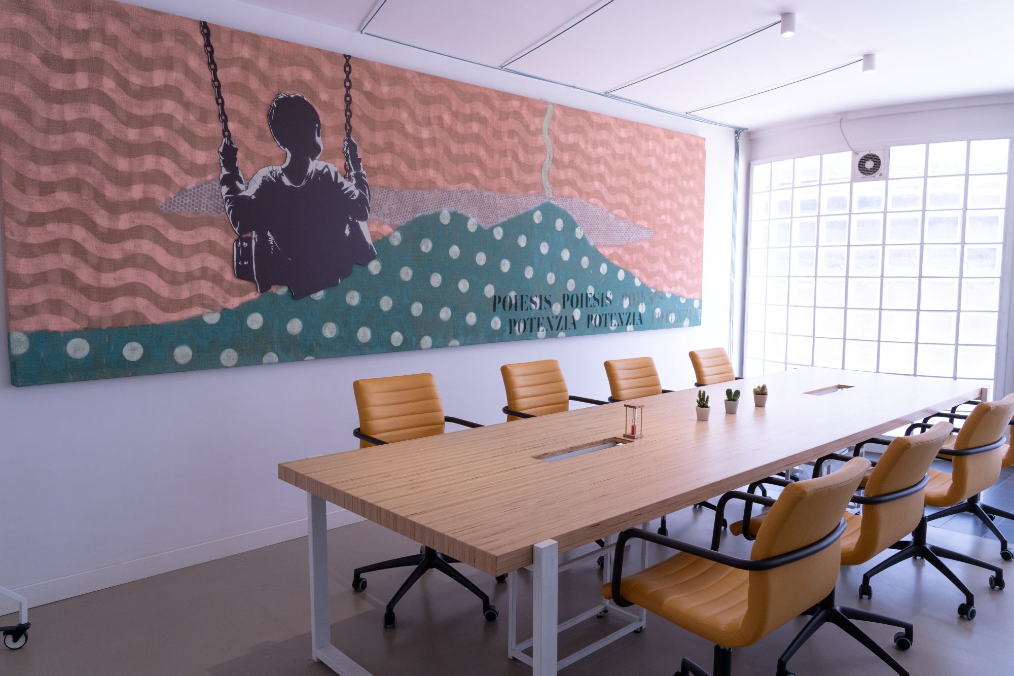 Large tables for shared work, desks, meeting room equipped with monitor and sound system, video call booths, wifi, wellbeing room.