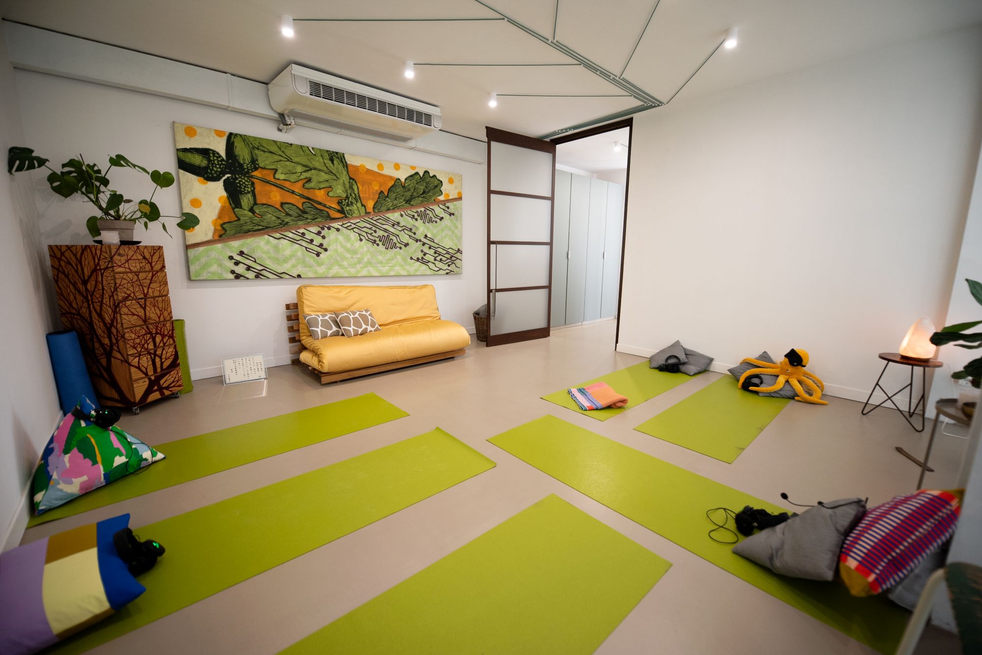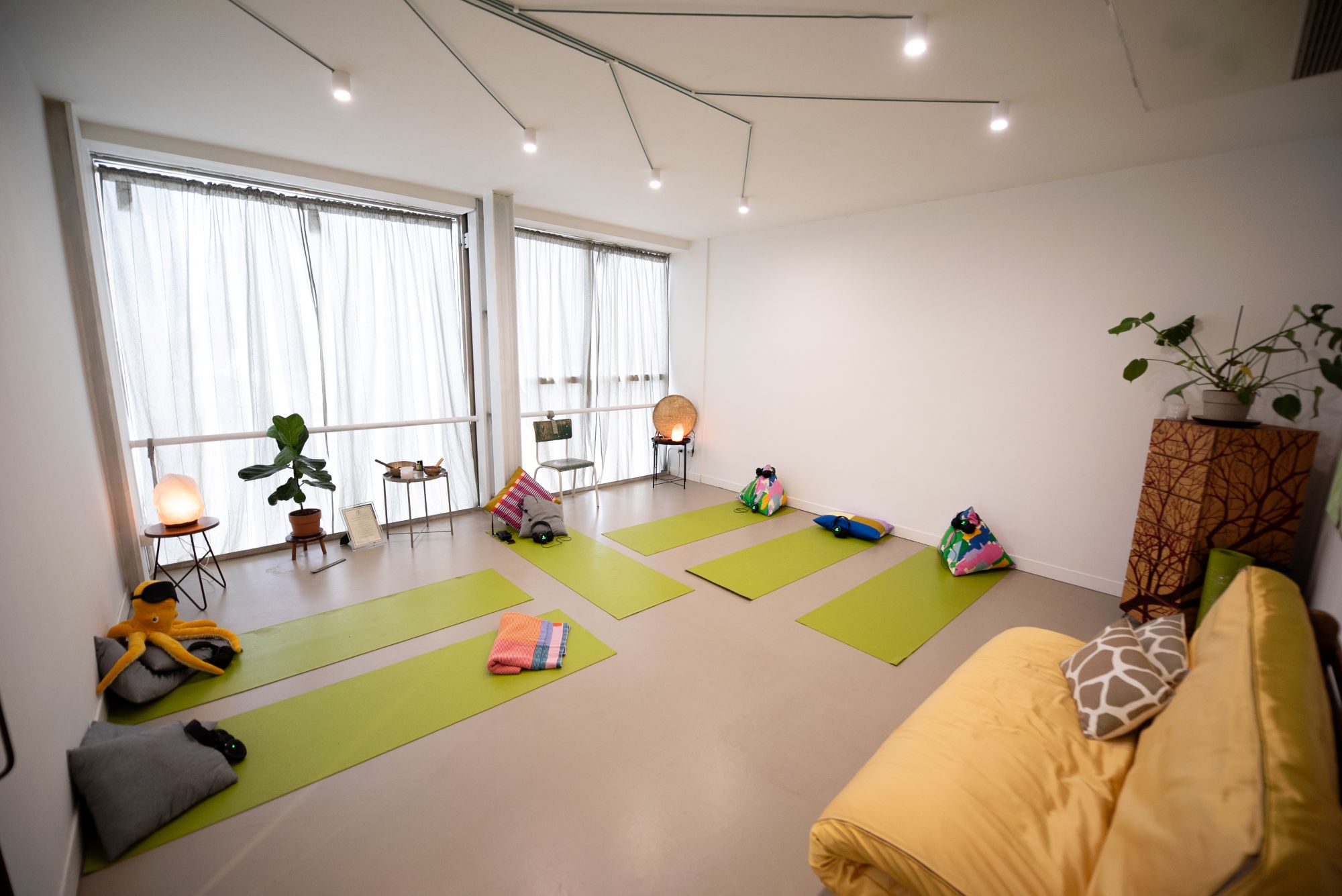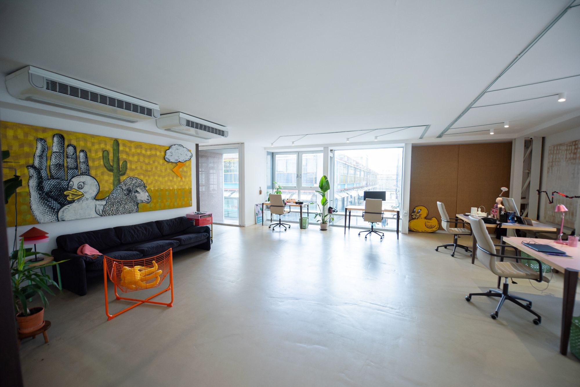 Large tables for shared work, desks, meeting room equipped with monitor and sound system, video call booths, wifi, wellbeing room.