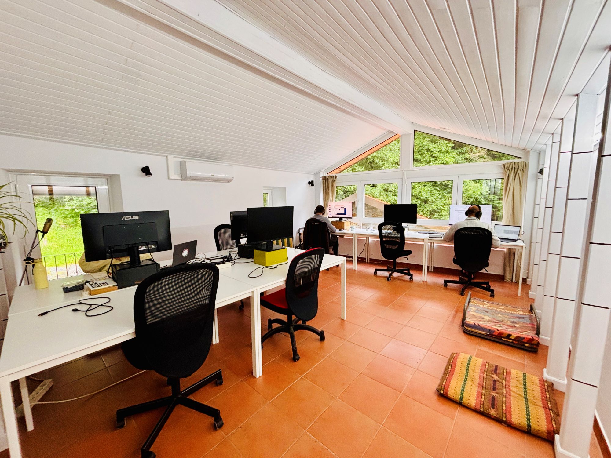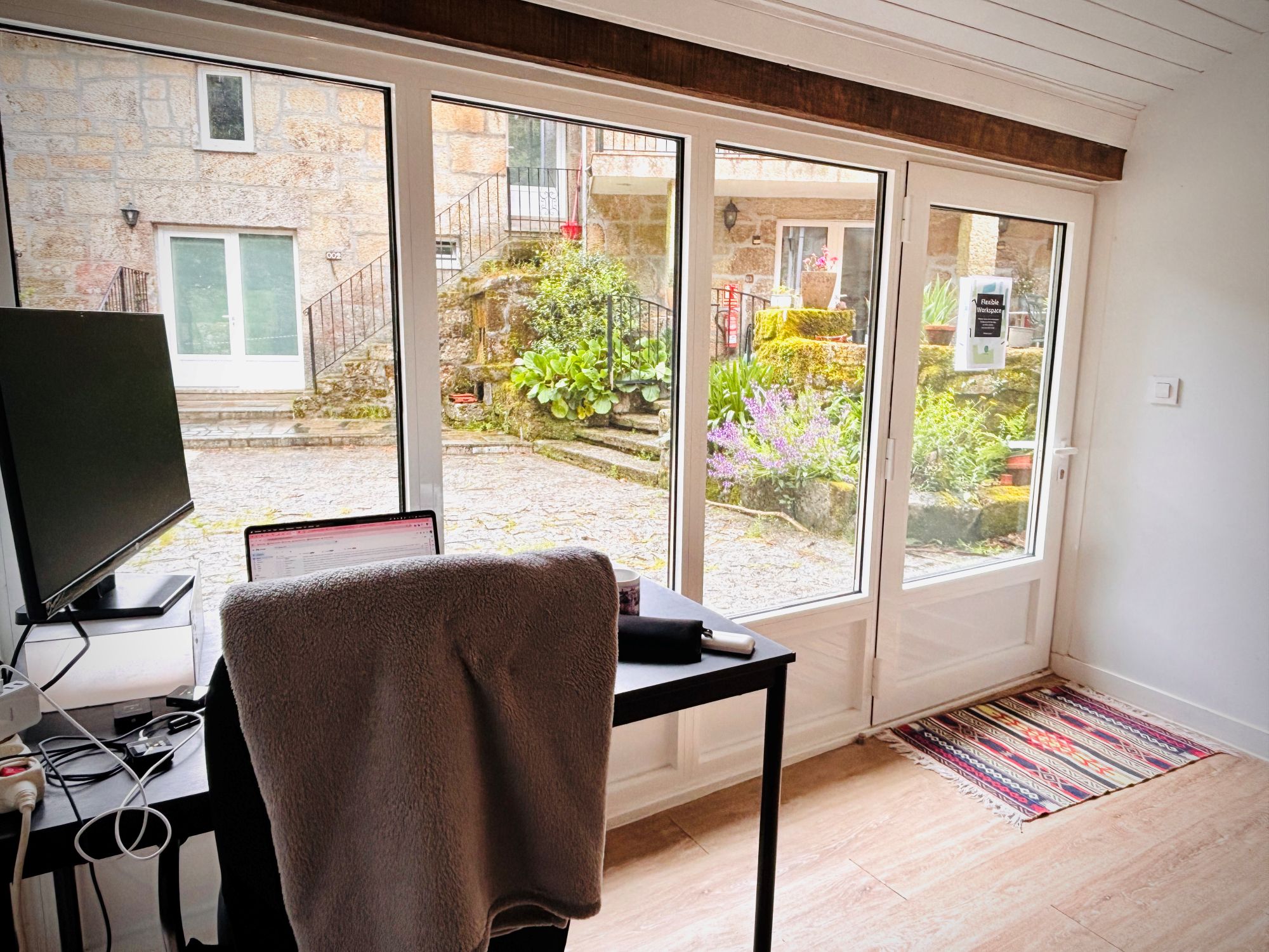There are also two coworking areas open 24/7, providing flexible space for desk-based work, digital editing, or research. Finally, the Casa do Pobo (the village’s communal house) is available on demand, including use of a fully equipped industrial kitchen, generally accessible between 10:00 and 22:00, depending on local programming and availability.